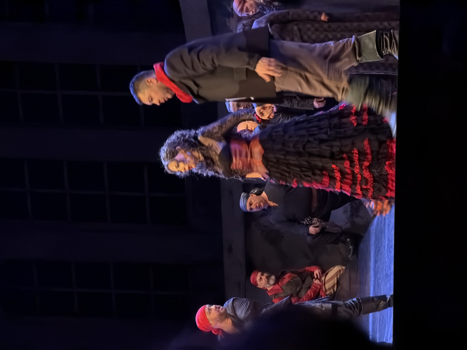 The image displays a theatrical performance on a stage in Plovdiv, Bulgaria, featuring at least seven individuals in period or dramatic costumes