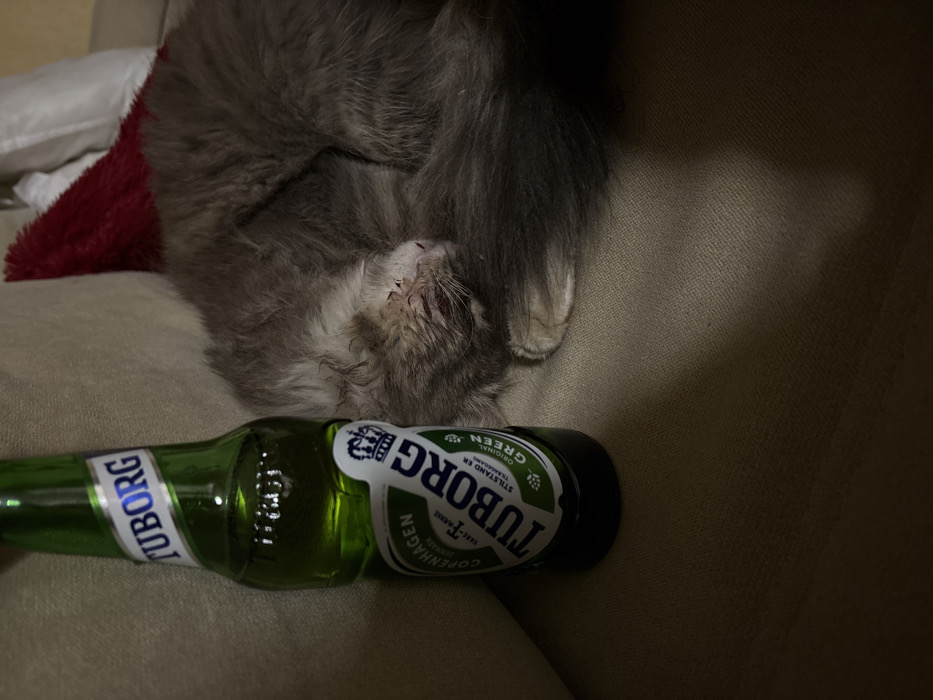 The scene depicts an indoor setting in Mikrevo, Bulgaria. A green glass bottle, identified by its label as "TUBORG ORIGINAL GREEN," stands upright on a light tan, textured upholstered surface. The bottle appears partially full of liquid. Adjacent to the bottle, on the same surface, a gray-furred feline is observed curled up on its side, asleep. Its head rests close to its front paws, and its tail is wrapped around its body. The fur around the cat's face, particularly near the eyes and nose, appears somewhat matted. In the background, behind the cat, a folded red fabric object is visible against a lighter, possibly white, background element. The overall lighting is dim. No human presence is observed.