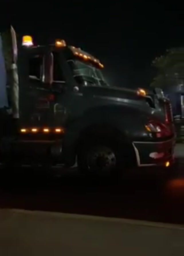 At night, a green semi-truck idles near what appears to be a loading dock or parking area. The truck has several lights illuminated on the front and top, including amber marker lights and a rotating beacon. A shipping container with the word "TRITON" on its side passes behind the truck. The environment is dark, with minimal ambient lighting. A palm tree is visible in the background.