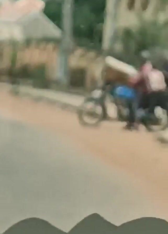 A blurred scene is captured from the interior of a moving vehicle. In the initial frame, a man on a blue motorcycle is visible on the side of the road. He is carrying what appears to be a flat, rectangular object. A building with a light-colored facade is in the background, partially obscured by trees and a utility pole. As the video progresses, the motorcycle and surrounding scene quickly fade out of focus due to the vehicle's movement.