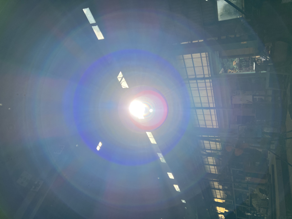 The image displays the interior of a large industrial facility in Chiba, Japan. A brilliant, centralized white light source, presumed to be a skylight or roof opening, dominates the upper mid-frame, emitting prominent, concentric circular lens flares in blue, purple, and red hues that spread across the upper portion of the image. The facility's structure features a high ceiling with multiple rectangular window panes and corrugated metal sections, supported by an internal framework. The upper and lower walls also exhibit similar rectangular windows and corrugated metal paneling. The lower half of the interior is dimly lit, containing various industrial objects and equipment. A stand-mounted fan or circular apparatus is visible in the mid-left. Other indistinct machinery, structures, and materials are present on the floor. A large open bay or doorway on the mid-right offers a partial view of an exterior environment, showing what appears to be vegetation or other outdoor structures. No individuals or specific human actions are discernible within the frame.