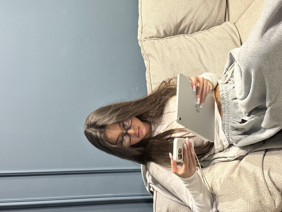 A young adult female subject is seated on a beige fabric sofa, engaged with two electronic devices. She wears dark-framed oval glasses, a light-colored ribbed long-sleeve top revealing a portion of her midriff, a gold-colored chain necklace, and grey drawstring sweatpants. Her long, dark brown hair is parted centrally and falls over her shoulders. In her left hand, she holds a light-colored smartphone displaying a multi-lens camera array on its rear. In her right hand, she holds a light-colored tablet, displaying a dark logo on its reverse. Her head is tilted downwards, and her gaze is directed towards the devices. The immediate background consists of a plain blue wall, featuring a decorative vertical panel with molding detail on the left side. The scene is an indoor environment, located in Yerevan, Armenia.