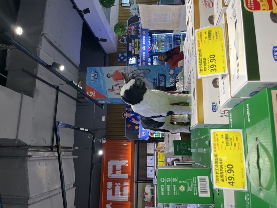 This image depicts an indoor retail environment, specifically a supermarket or large grocery store, located in Jiangjin, China. In the foreground and midground, a prominent, black and white, life-size cow mannequin with visible udders stands on what appears to be artificial green grass. Surrounding the mannequin and extending into the foreground are multiple product displays consisting of stacked cardboard boxes. On the left, green boxes with white lettering are visible, one featuring a yellow price tag displaying "49.90" and Chinese characters. To the right, white and beige boxes, some with images of individuals, have similar yellow price tags, one showing "39.90" and Chinese characters. In the midground, behind the cow mannequin and product displays, a dark-skinned individual wearing a red long-sleeved shirt is visible, standing or seated behind a counter. In the background, various elements are present: a large vertical banner with a "G" logo and Chinese text (reading "日常补水" - Daily Hydration), featuring a male and female exercising alongside a bicycle. To the left of this banner, a large orange corrugated wall structure displays the partial white lettering "TER." Further into the background on the right, Pepsi-branded beverage refrigerators are visible, along with additional promotional signage and QR codes. A small white sheep figurine is positioned on a shelf in the far left background. The ceiling features exposed grey ducts, black track lighting fixtures with multiple spotlights, and recessed lighting. Several green spherical decorative elements are suspended from the ceiling in the upper right.
