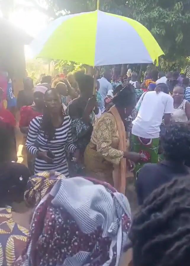 large group of people gathered outdoors, likely at an event. Many individuals are wearing traditional African clothing. A woman in a patterned gold outfit is standing prominently, being shielded from the sun by a yellow and white umbrella. The environment appears to be a rural setting with trees in the background and dirt on the ground. The atmosphere appears celebratory, and it seems to be a gathering with music playing.