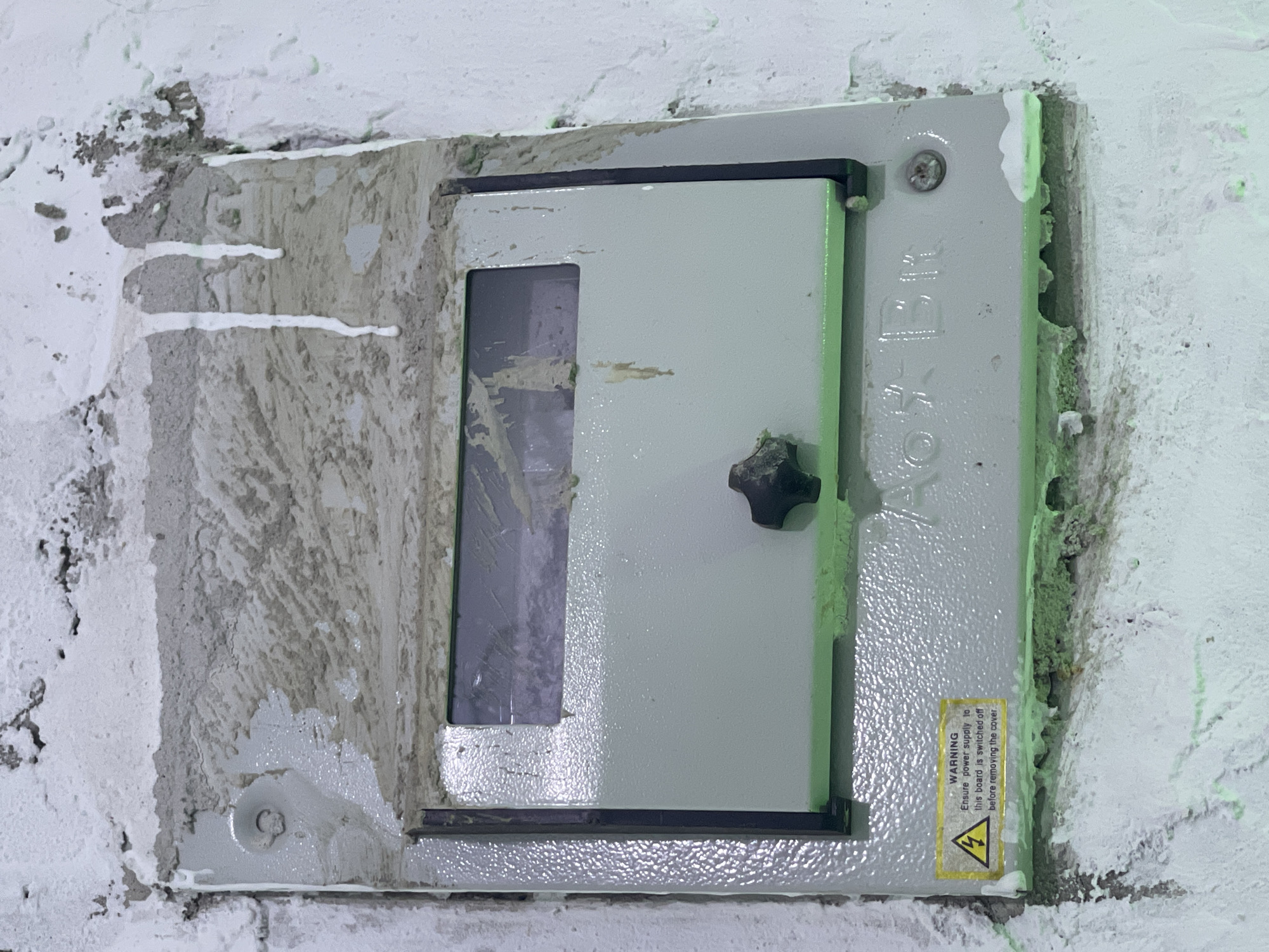 A gray electrical panel is mounted on a roughly plastered and textured wall