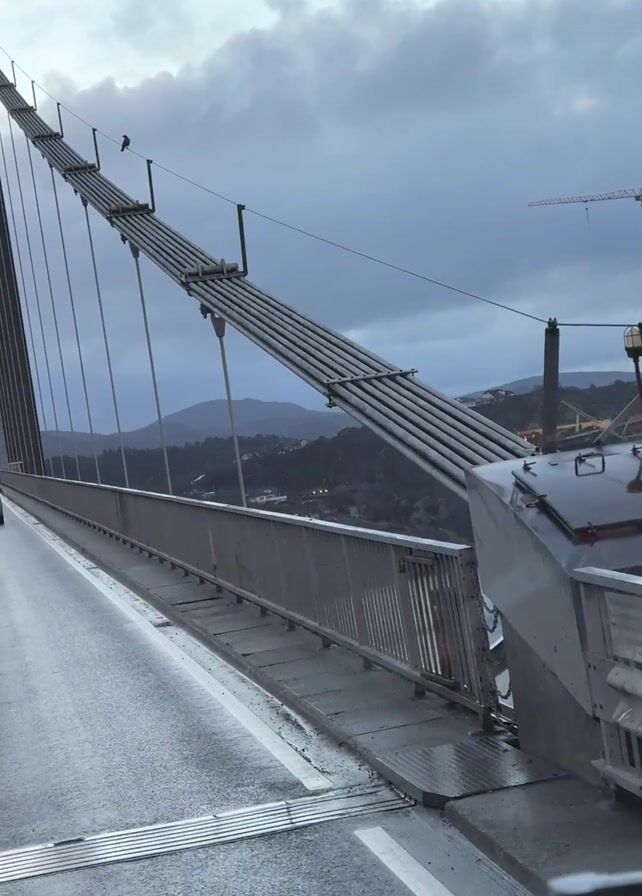 car driving across a cable-stayed bridge on a wet day