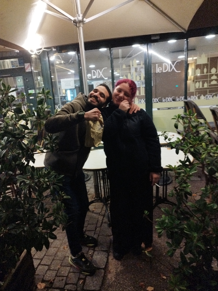 The image displays an outdoor scene at the Le DIX brasserie, located at Place Kléber in Strasbourg, France. Two individuals are positioned centrally on a cobblestone pavement, illuminated by artificial light, likely in the evening or night. The individual on the left is a male with dark hair and a beard, wearing a dark olive-green hooded jacket, dark trousers, and black athletic shoes with neon yellow-green accents. He is smiling at the camera, holding a light-colored paper bag in his left hand, and his right arm is around the shoulder of the second individual. A dark wristband or watch is visible on his left wrist. The individual on the right appears to be female, with red/pink hair, wearing a dark, possibly black, long-sleeved top and dark lower garments. She is also smiling at the camera, with her left hand resting on her chin or cheek. A lit cigarette is held between the fingers of her right hand, which is lowered to her side. Her right arm is beneath the right arm of the male subject. In the background, large glass windows of the "Le DIX" establishment are visible, featuring its illuminated name and internal shelving with decorative items. Several dark metal outdoor tables with light-colored tops are present in the midground. Overhead, a large, light-colored patio umbrella structure with a visible lighting fixture to the left provides illumination. Green, leafy plants in planters frame the foreground on both sides of the subjects.