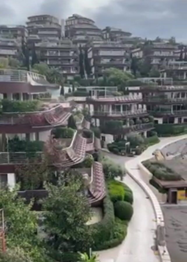 The camera pans across a seaside resort on a cloudy day. The resort is built into a hillside, with multiple tiers of buildings cascading down towards the beach. The buildings have a modern design, with flat roofs and balconies covered in greenery. A winding stone path leads from the resort down to a sandy beach, where waves gently roll onto the shore. The water is a clear turquoise color. The sky is overcast, creating a soft, diffused light over the scene. There are no people visible in the frame.