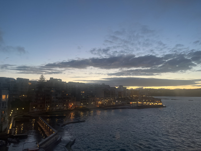 The image displays an elevated twilight scene of Saint Paul's Bay, Malta