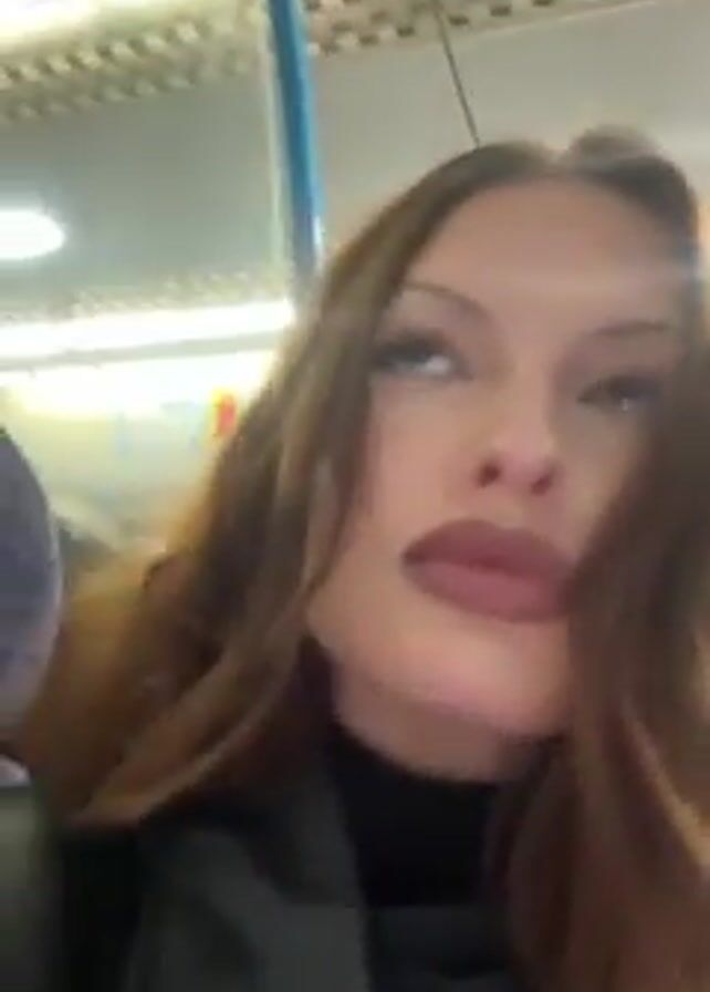 A woman with brown hair and dark lipstick applies lip balm on a train. She is wearing a black turtleneck sweater and a black leather jacket. The train car has purple seats and a white ceiling with fluorescent lights.
