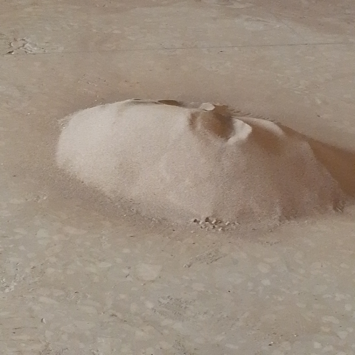 A mound of pale, fine sand sits on a speckled, light brown surface