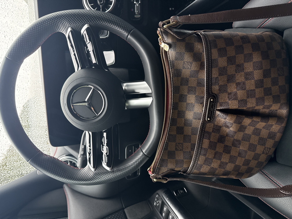 The image displays the interior of a vehicle in Pétange, Luxembourg. A brown and dark brown checkered shoulder bag, identifiable as Louis Vuitton with a visible "Louis Vuitton" plaque and a pleated front, rests on a dark car seat in the foreground. Directly above and behind the bag, a black leather steering wheel with red stitching and perforated grips is prominent, featuring a silver Mercedes-Benz logo at its hub. Integrated controls are visible on the steering wheel spokes. A digital display screen is partially visible behind the steering wheel. The vehicle's windshield, seen in the upper portion of the frame, is covered with numerous raindrops, indicating wet external weather conditions.