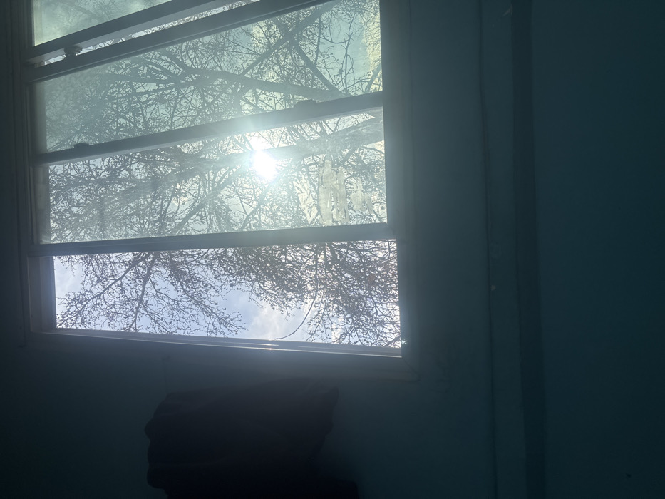 An interior photograph taken from a room in Tashkent, Uzbekistan, captures a view through a multi-pane window. The interior wall, occupying the left and lower portions of the frame, is painted in a dark teal hue. A dark, indistinct fabric item is partially visible hanging on the upper left wall. The light-colored window frame divides the image, showcasing an exterior scene. Outside, a large deciduous tree, devoid of leaves, presents a dense network of dark branches silhouetted against a bright, partially cloudy sky. The sun is directly visible through the branches in the middle-right section of the window, generating a pronounced lens flare and strong backlighting. The windowpanes display visible smudges and dust. No individuals or animals are present in the scene.