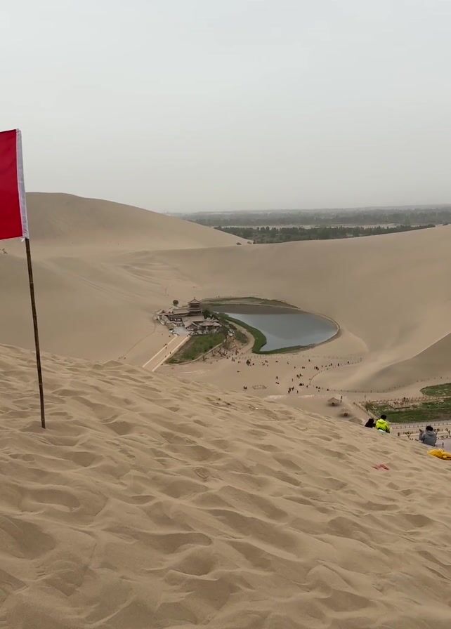 The camera pans over a desert landscape, revealing a small lake surrounded by a building and greenery. People are seen walking around the lake and sitting on the sand dunes. A red flag is planted in the sand in the foreground. The sky is overcast.