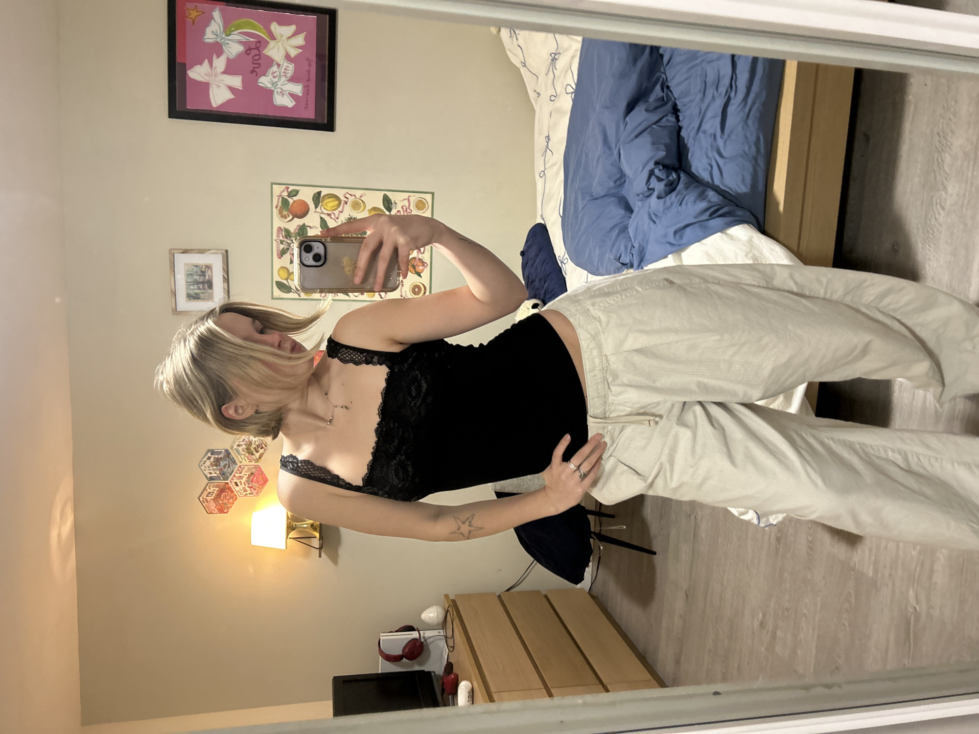 A woman is taking a mirror selfie indoors. She is wearing a black lace-trimmed tank top and light-colored, striped pants. She has blonde hair. She is holding a phone with a beige case. The room contains a bed with a blue comforter, a wooden dresser, artwork on the wall, including one with a fruit motif, and a lamp. There is also a set of hexagonal wall decorations. A television and headphones are visible near the dresser. There is not enough information to determine the exact location within Vancouver, Canada.