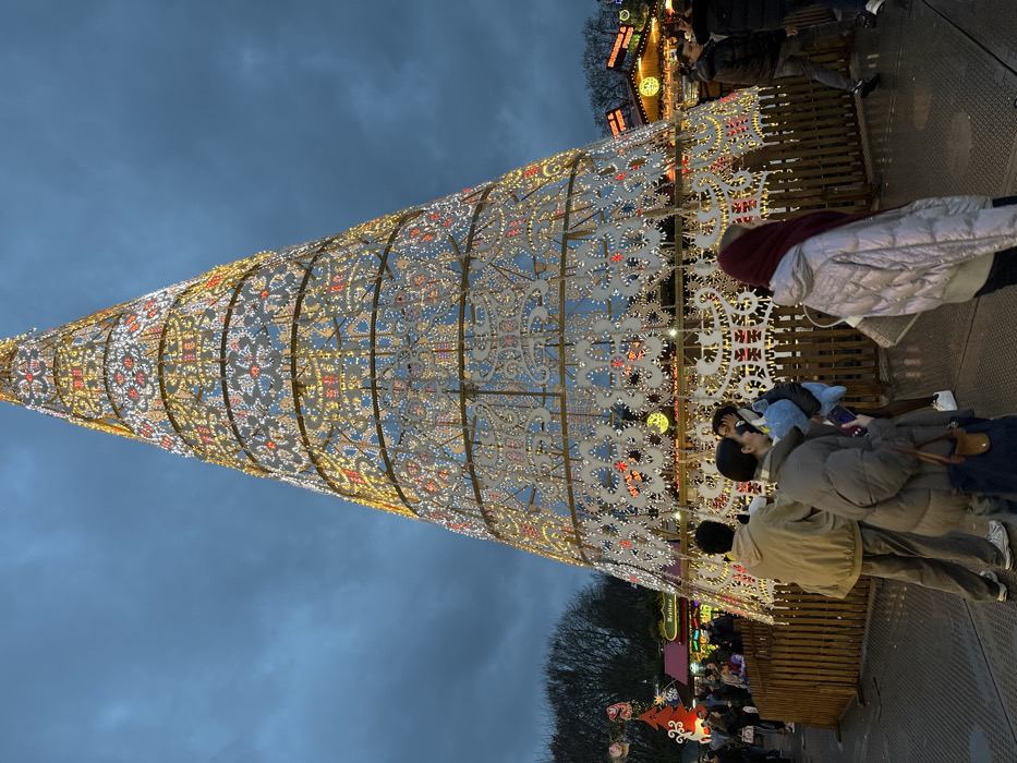 An elaborately decorated Christmas tree made of lights dominates the scene, stretching upwards against a cloudy sky