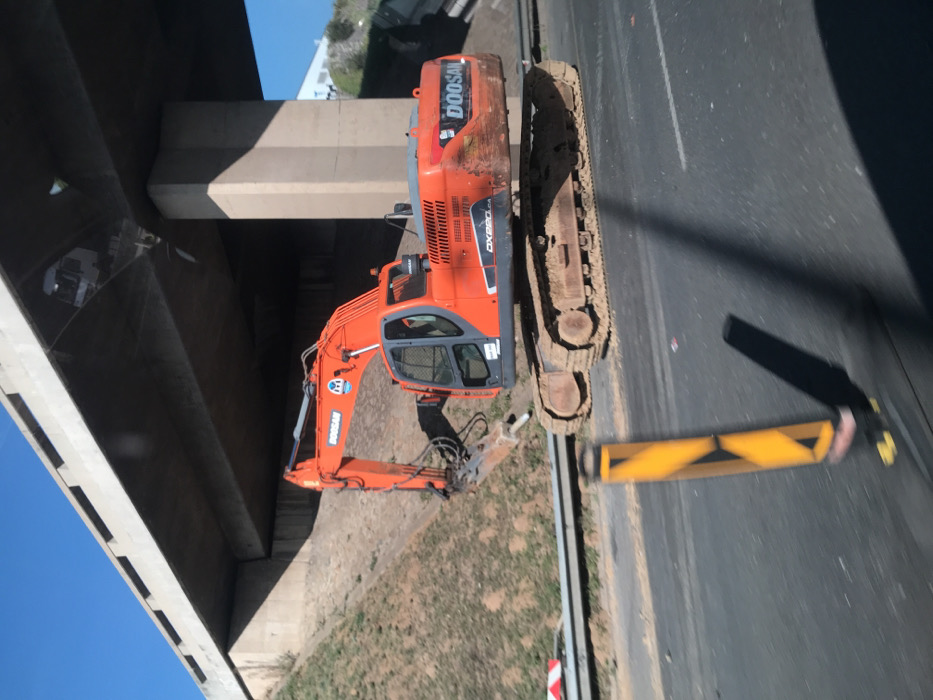 An orange Doosan DX220LCA crawler excavator is parked under a concrete highway overpass in Sandton, South Africa