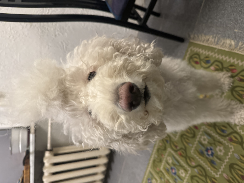 - "An interior shot in the city of Unknown, Unknown, depicts a white canine with dense, curly fur standing upright on a green patterned rug" by FM-7VPBW2, licensed under CC BY 4.0