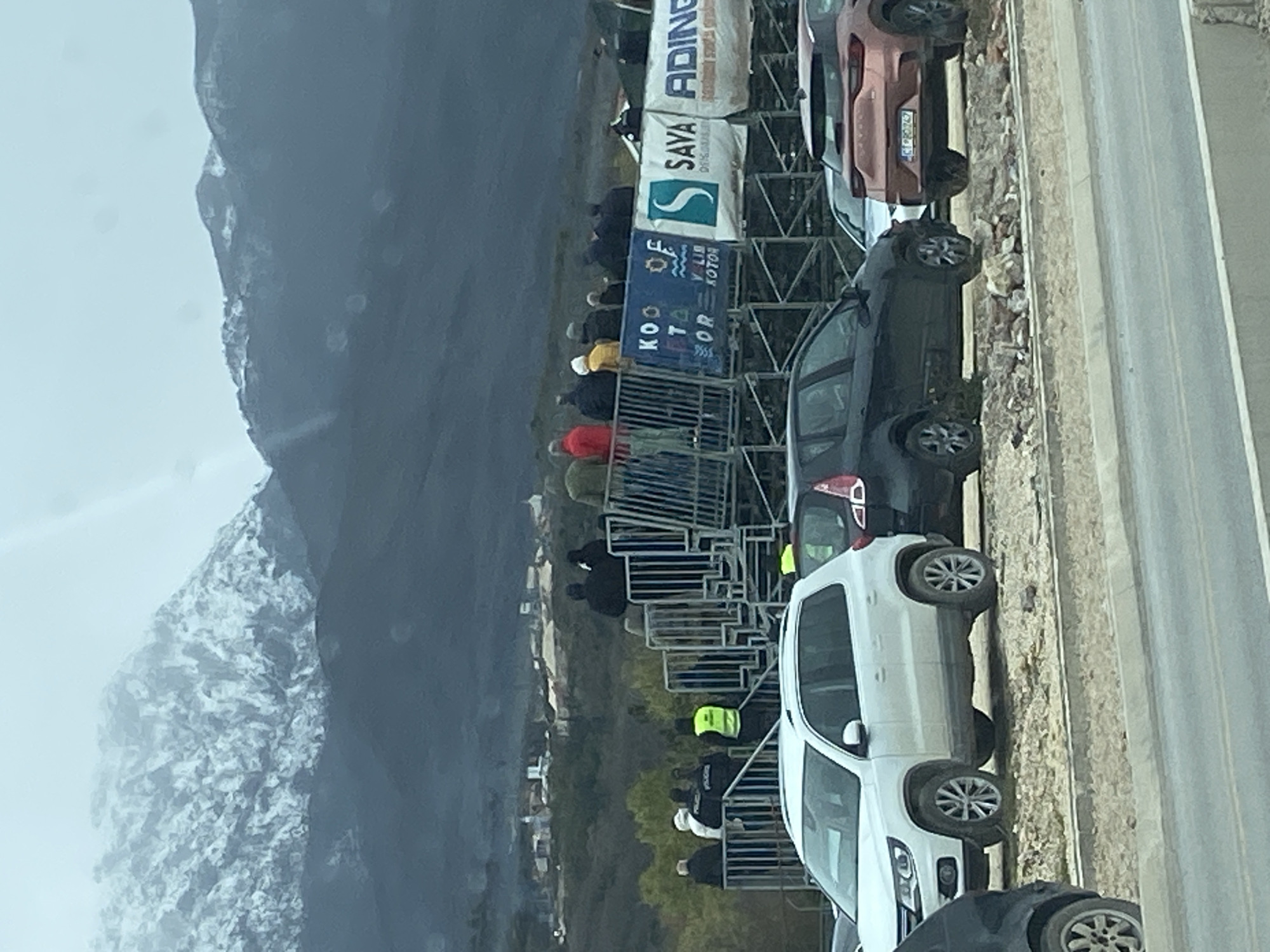 This image depicts an outdoor scene in Dub, Montenegro, under an overcast sky. In the distant background, snow-capped mountains rise, with their lower slopes appearing dark and heavily vegetated. A small village or settlement with multiple buildings is visible on a lower hillside in the mid-background. In the mid-ground, a temporary metal bleacher structure is erected, supporting approximately twenty to thirty individuals, most facing away from the camera as if observing an event. These individuals are dressed in various jackets and pullovers, suggesting cool weather. Among them, two individuals on the lower left stand wear dark uniforms resembling police attire, one with a white head covering. Another individual on the lower bleacher section wears a bright yellow-green high-visibility vest. Attached to the front of the bleacher structure are multiple white banners displaying sponsor logos, including "SAVA" and "ADING," with other text partially visible, such as "KOO TA OR V LIB KOTOR." Below the bleachers, a rough, unpaved area serves as a parking space for several vehicles. A white Volkswagen Tiguan SUV is prominently parked on the left. To its right, a dark hatchback and a copper-orange SUV (identified by a "CT BD247" license plate, indicating Cetinje registration) are also parked. The foreground shows a paved road surface with a curb, and water droplets are visible on the lens or window through which the image was captured, suggesting rain or condensation.
