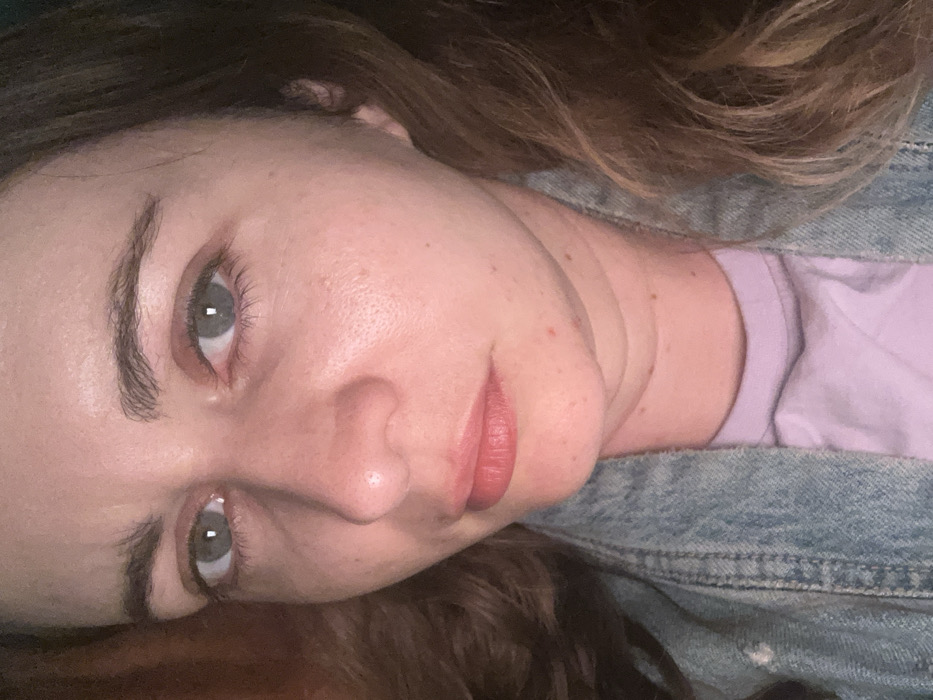 A close-up portrait features an adult female with fair skin, prominent cheekbones, and dark brown, wavy hair visible on the right side. Her gray-blue eyes are open and directed forward, with dark eyebrows. The nose is straight, and the lips are naturally colored with a slight pink hue, appearing closed. Her skin shows some minor texture and scattered small blemishes, particularly on the chin and right cheek. She is wearing a light purple crew-neck shirt beneath a light blue denim jacket, with stitching details visible on the jacket collar and shoulder area. The background is indistinct and dark, offering no environmental details. No specific location within Tel Aviv, Israel, or any other city can be determined from the visual information provided.
