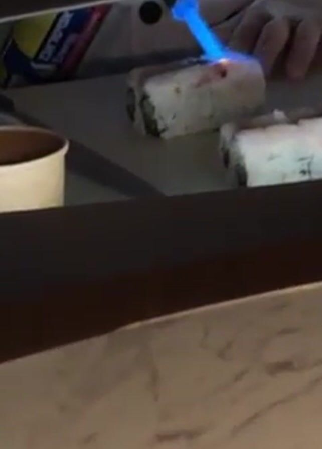 A person wearing gloves torches a sushi roll with a blue flame. The sushi roll is on a white cutting board, next to another roll. The rolls appear to contain rice, avocado, and other ingredients. The torch is held in the right hand and is angled downwards. The scene is observed from a low angle, through an opening or a serving window. Part of a box with Hebrew text is visible to the left of the person's hand. A small, white cup is also on the left side. The countertop is a marble pattern.