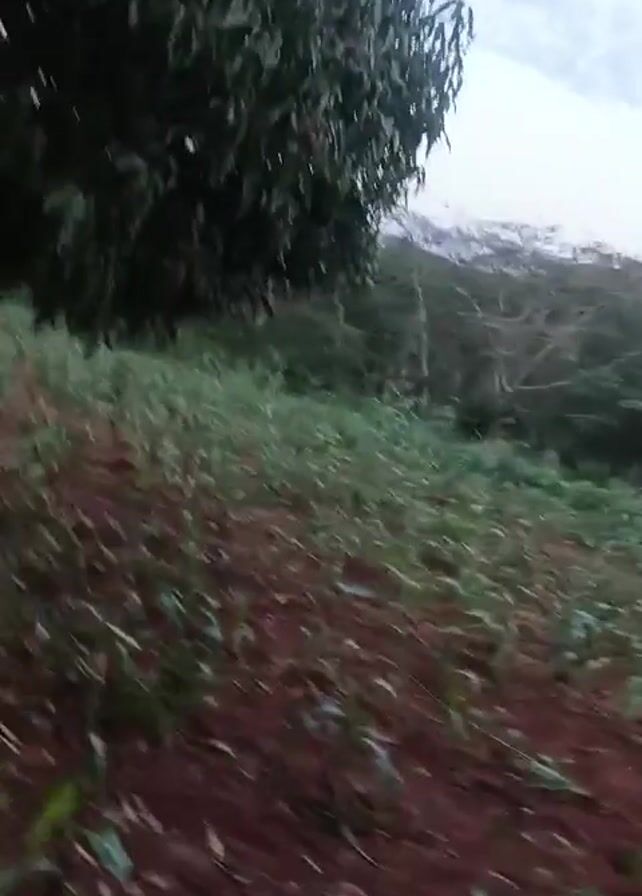 The video pans over a field of young corn plants growing in red soil. In the background, a dense line of trees and bushes is visible, stretching across the horizon. The sky is overcast with scattered clouds. The camera movement is unsteady, creating a slightly blurred effect. A tree with dense green leaves is also visible during the video.
