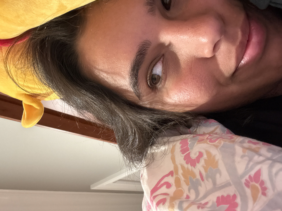 A close-up, eye-level image depicts the upper right quadrant of an adult individual's face in an indoor setting in Princeton, United States. The individual has dark brown, wavy hair framing their face, and brown eyes looking towards the upper right. A subtle, closed-mouth smile is present. The skin displays visible pores and a natural flush on the cheek. To the immediate left, a white blanket with a repeating floral/paisley pattern in pink, orange, and light blue covers part of the individual's side. In the background, above the individual's head, a dark brown wooden bed frame or headboard is visible, partially obscured by a bright yellow, soft object featuring a distinct ear-like protrusion, indicative of a plush toy or character pillow. A white vertical furniture element is partially visible further left in the background. The scene is brightly lit, casting soft shadows on the face.