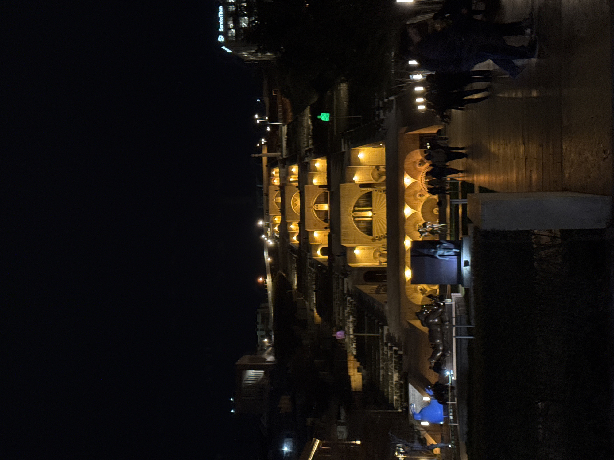 Cascade monument in Yerevan, Armenia, at night. The structure is brightly illuminated with yellow lights, highlighting its tiered design with arches and sculptures. People are walking on the upper levels of the Cascade. A modern building with illuminated signage can be seen in the background. A variety of sculptures and greenery are visible at the base of the monument.