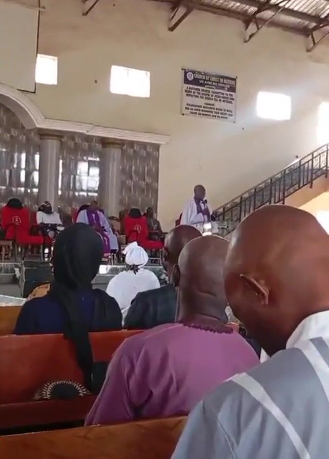 n indoor church service. A man is speaking from a raised platform or pulpit. The congregation is seated on wooden benches, facing the speaker. The attendees are diverse. The building has a high, open ceiling with exposed metal beams. Several windows provide natural light. A sign on the wall reads "Church of Christ in Nations". There's a railing near the platform and stairs leading up to it.