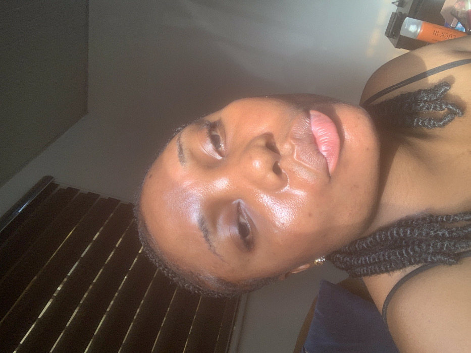 A close-up photograph displays an individual with dark skin, likely female, framed from the mid-chest upwards