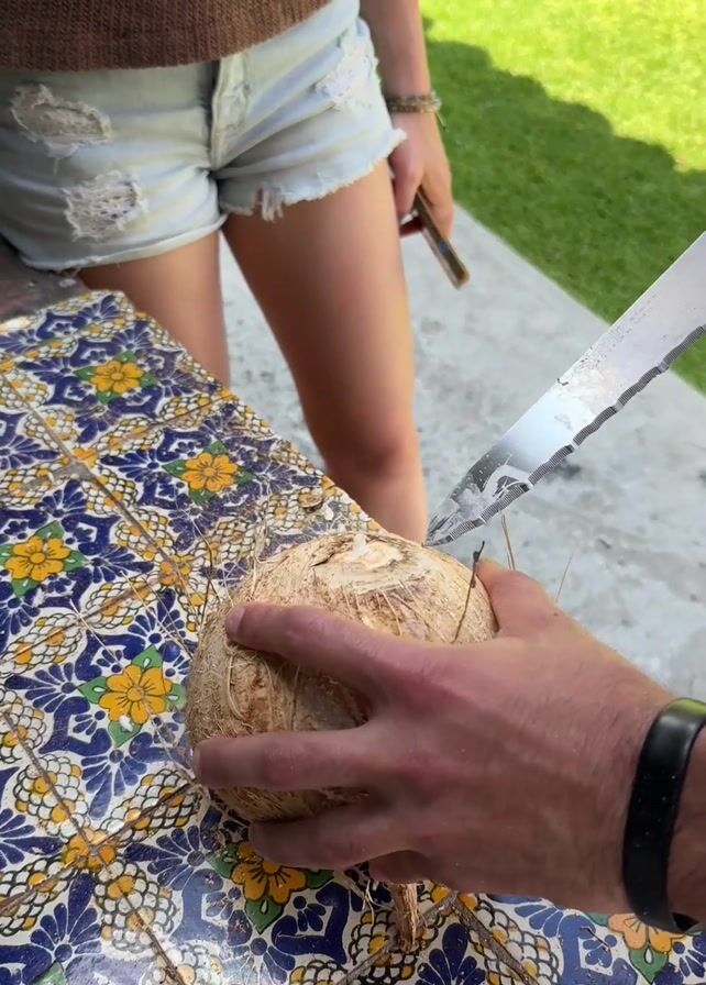 A man is shown attempting to open a coconut with a serrated knife on a table covered with colorful tiles