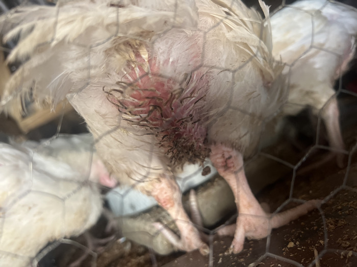 This image depicts a close-up, rear view of a white chicken confined within a wire mesh enclosure in Birnin Kebbi, Nigeria. The primary subject chicken exhibits severe injury around its vent area, characterized by extensive redness, inflammation, and what appears to be exposed tissue or matted, soiled feathers. Dark, coarse debris or feathers are visibly attached to the raw, reddish skin. Its legs are pinkish-yellow, scaly, and appear dirty, with one foot splayed on the brown, particulate ground material, consistent with dirt or wood shavings. Other blurry white chickens are partially visible in the background, also behind the hexagonal wire mesh, suggesting multiple birds in the same enclosure. No human subjects are visible.