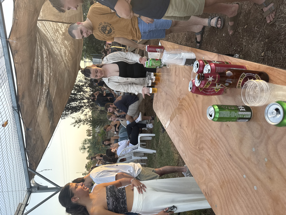 An outdoor social gathering is observed in the Gilboa Regional Council, Israel, under a light-colored tarp providing shade, supported by a metal frame. The scene is illuminated by late afternoon or early evening light. In the immediate foreground, a long, light-colored wooden table occupies the lower half of the frame. On the table, various beverage containers are present, including multiple green Heineken beer cans (some open, some stacked), red Goldstar beer cans, and an empty brown Goldstar beer bottle. Several clear plastic cups, some containing a light-amber liquid consistent with beer, are arranged on the table, along with a stack of unused clear plastic cups. Visible liquid spills and marks are on the table surface. To the left of the table, a young woman with dark hair, wearing a black lace strapless top and white wide-leg pants, stands with her right hand resting on her abdomen, looking towards the left with a slight smile. To the right of the table, a young woman with dark hair tied back, wearing a beige jacket over a black top, stands facing the table with her hands positioned over the plastic cups containing beer. To her right, a young man wearing an orange "Timberland" t-shirt and blue shorts stands, looking to the left. Partially visible on the far right is another young man in a dark t-shirt and khaki shorts, also looking left. In the mid-ground and background, numerous other individuals, primarily young adults, are gathered. Some are seated on white plastic chairs around smaller tables or on the ground, while others stand and socialize. Visible background elements include green foliage, trees, and power lines against a clear sky. The ground appears to be a mix of dirt and sparse grass.