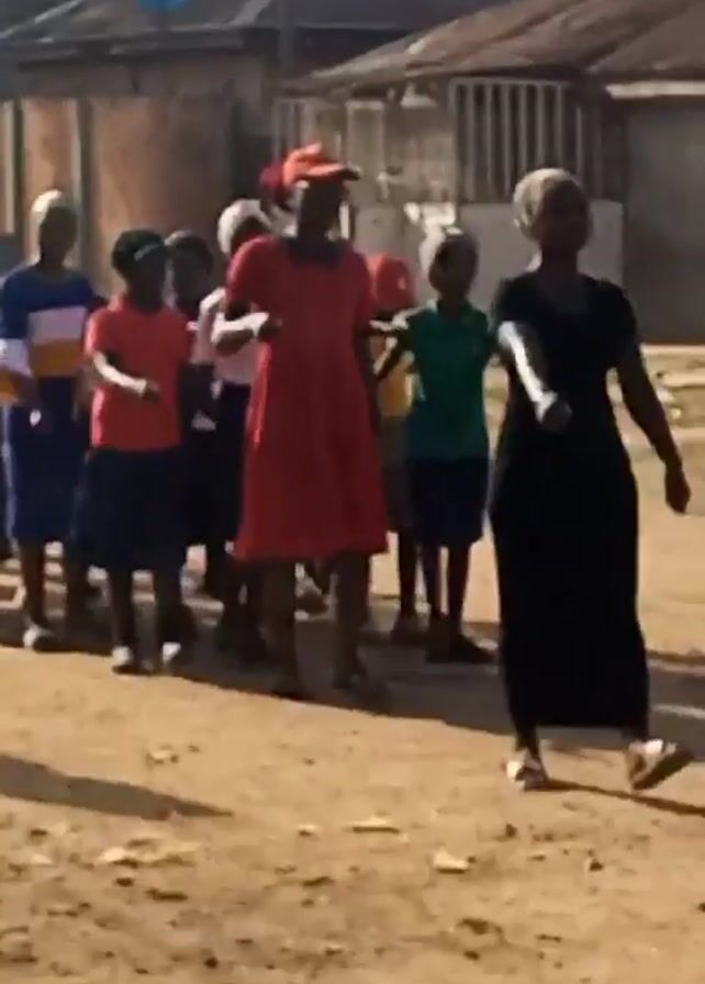 group of people, including children and adults, walking along a dirt road in what appears to be a village or rural area. They are walking in a line, with some of them wearing matching outfits or colors. The person in the front is wearing a red dress and hat. The background includes buildings with metal roofs and a satellite dish. There is no audio in this snippet.