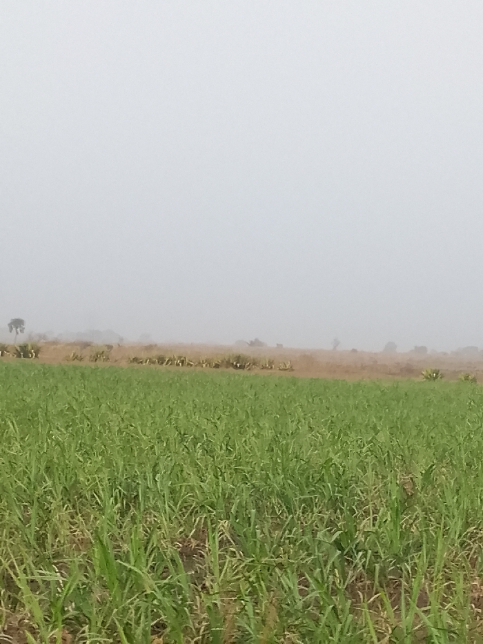 The image displays an agricultural landscape in Kerang, Nigeria, viewed under hazy atmospheric conditions. The foreground features a cultivated field of uniform, vibrant green, grass-like plants, likely young sugarcane or maize, extending across the lower portion of the frame. The plants are densely packed, with darker soil visible between rows. In the midground, a distinct horizontal band of drier, lighter brown vegetation or earth separates the green field from the distant horizon. Scattered larger green plants, possibly succulents or small bushes, are visible within this midground band. The sky, occupying the upper two-thirds of the image, is a uniform light grey, indicative of overcast conditions or significant atmospheric haze, such as fog or harmattan dust, which obscures visibility of distant features and renders the horizon indistinct. No individuals, animals, or artificial structures are discernible within the frame.