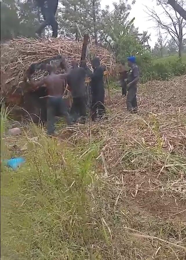 The video depicts a group of people in a field, apparently unloading a truck piled high with dried plant material