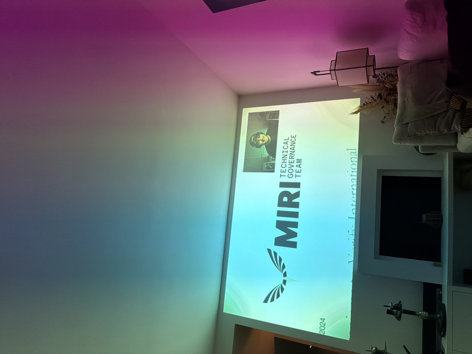 A projected image fills the frame. The presentation states "MIRI Technical Governance Team," alongside an image of a person. An avian-inspired logo is also visible. The text "Verify: International" and the year "2024" are present. To the right, a lamp, pillows, and furniture are visible, next to a dark screen within a light frame. The wall in the background is colored with a gradient going from blue to purple.