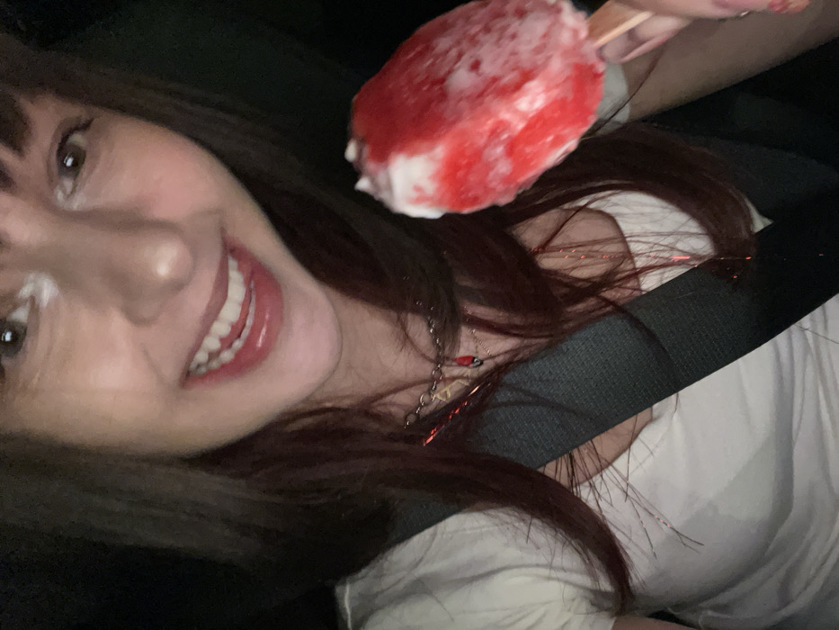 A woman smiles at the camera while holding a red and white popsicle. She is wearing a white shirt, a seatbelt, and a delicate chain necklace. Her dark brown hair frames her face, with bangs reaching her eyebrows. The setting appears to be inside a car, with a dark background. She has fair skin and her lips are brightly colored.