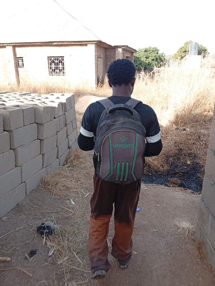 A person from behind, wearing a black shirt with white sleeves and brown pants with darker knees, is walking away from the viewer. They are carrying a backpack with "HPPOWER" written on it. To their left is a pile of grey concrete blocks, and a building can be seen in the background. The ground is dirt and dry grass, with some charred remains visible near the right. Another partial wall frames the right side of the shot.