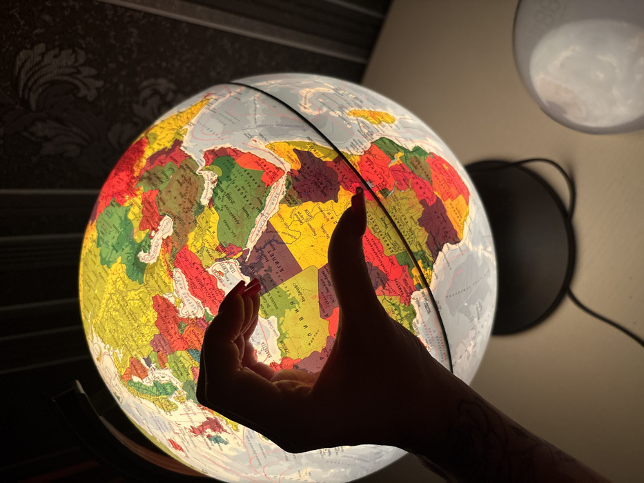 An illuminated political globe, displaying countries in various colors with names primarily in Cyrillic script, serves as the central focal point. The globe rests on a dark circular base from which an electrical cord extends. A human hand, silhouetted against the brightly lit globe, forms a heart shape with its thumb and index finger, positioned over the region encompassing parts of the Middle East, Africa, and Europe. The fingernails of the hand are painted red. In the lower right background, a smaller, white spherical object is partially visible, reflecting some light. The globe is situated on a light-colored surface. The background is predominantly dark, with a subtle patterned wallpaper visible in the upper right. The scene is dimly lit, with the globe itself acting as the primary light source. This scene is located in Simferopol, Ukraine.
