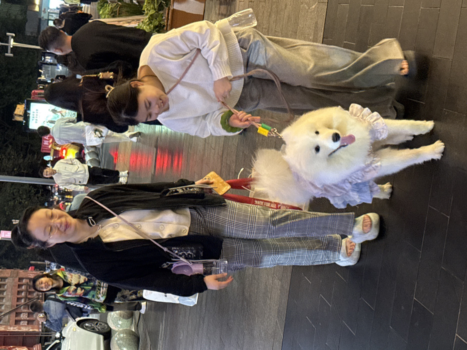 A full-frame, eye-level photograph captures an urban sidewalk scene at night or dusk in Yuzhong District, China, under artificial illumination. Three primary subjects – two East Asian women and a Samoyed dog – are depicted moving from left to right across the paved walkway. The woman on the left, an adult female with round eyeglasses, wears a black zip-up jacket over a cream button-up cardigan, grey and white plaid trousers, and white fuzzy slides. A light pink crossbody strap traverses her chest. A clear water bottle with a pink cap and black dispenser is clipped to her left side, and a yellow, rectangular object is held in her right hand. A patterned bag hangs from her left shoulder. She exhibits a subtle smile, gazing forward. To her right, a second adult female, wearing a cream long-sleeved sweater, light gray wide-leg trousers, and dark open-toed sandals, holds a leash attached to the dog. She is leaning slightly forward and smiling broadly downwards. A light pink crossbody strap is visible, and a clear plastic pouch hangs from her right hip. Positioned between the two women and slightly ahead, a white, fluffy Samoyed dog stands on all four paws, facing forward and slightly to the right. Its tongue is partially extended. The dog is adorned with a light purple ruffled garment. The background is out of focus, revealing multiple blurred pedestrians, a white vehicle on the far left, and indistinct building facades with illuminated signs. Light reflections are visible on the dark, possibly wet, paved ground. Spherical light gray bollards are aligned along the left edge of the sidewalk, and planters containing greenery are situated on the right.