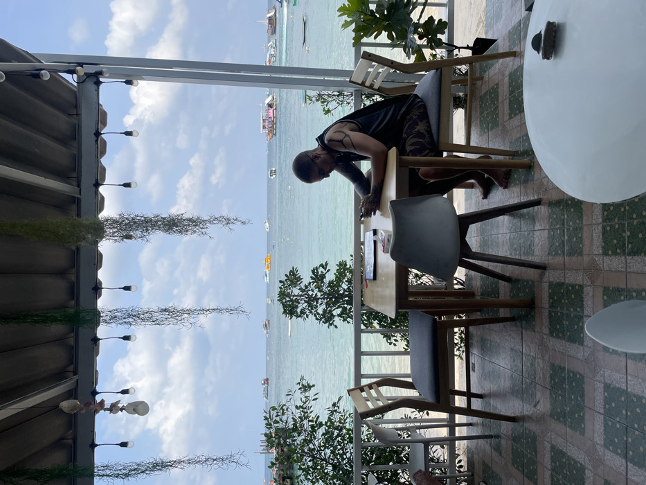 A man leans over a table on a restaurant patio, with a turquoise ocean view. The man has tattoos on his arms and head, and is barefoot. The patio has greenery, hanging lights, and tiled flooring. White tables and chairs are visible, along with the ocean beyond the railing. Boats are visible on the water under a blue and cloudy sky.