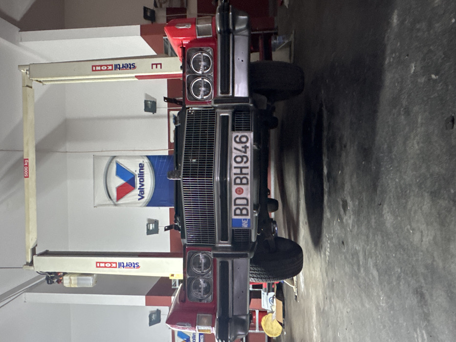 The scene depicts the front of a red, classic-style vehicle, possibly a Cadillac, suspended on a two-post lift within an auto repair shop or garage in the city of Unknown, Unknown