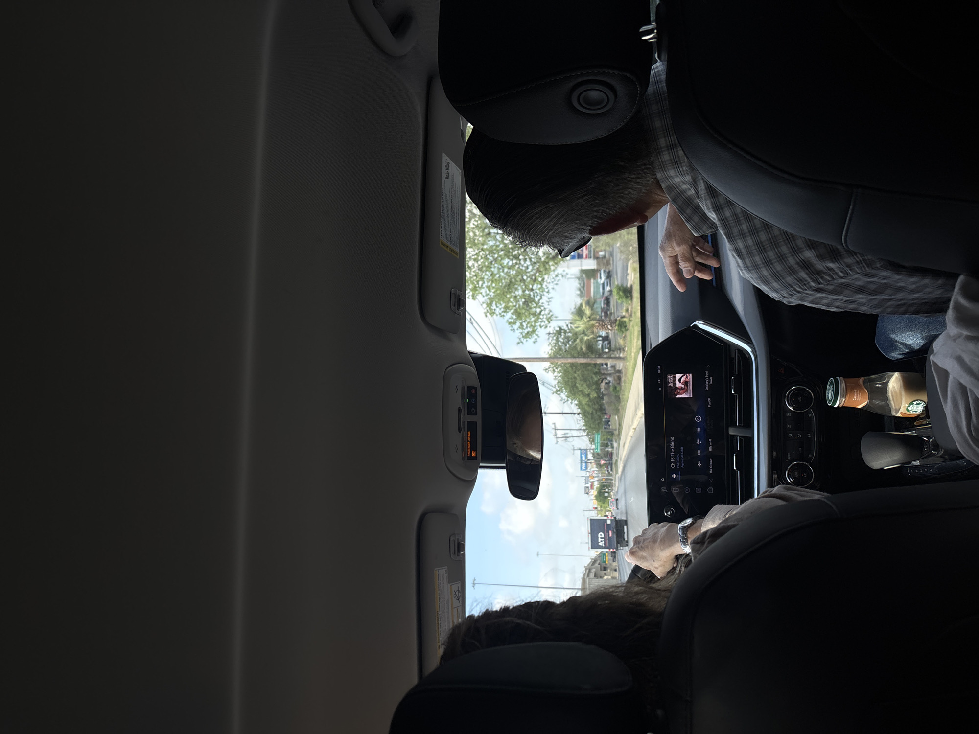 This image depicts the interior of a vehicle from a rear passenger perspective, showing two occupants in the front seats traveling on a multi-lane highway identified as US-90 West near Ingram Road in San Antonio, Texas, USA. The identification is supported by visible green road signs in the background indicating "Ingram Rd," "Hwy 90 W," and a prominent "Walmart" sign on the right side of the road. The driver, an adult female with long, dark, wavy hair, is visible from the back, gripping the steering wheel with both hands. She wears a light-colored long-sleeved garment and a silver-toned watch on her left wrist. The front passenger, an adult male with short, gray hair and glasses, is seated to the right, wearing a plaid short-sleeved shirt; his right forearm rests on the center console. The vehicle's infotainment system is active, displaying "Ch 16 The Blend" and "Phil Collins Against All Odds," along with the current time of 10:08 and an ambient temperature of 74 degrees Fahrenheit. In a cup holder on the center console, a Starbucks bottled Caramel-flavored drink is present. An overhead console features an illuminated "PASSENGER AIR BAG" indicator. A partial reflection of a person's head, likely the photographer, is visible in the rearview mirror. Outside the vehicle, the road extends forward with other vehicles, including a black truck bearing the "ATD" (American Tire Distributors) logo. A concrete highway overpass structure is visible on the left. The environment includes a clear blue sky with scattered white clouds, green trees (including palm trees) lining the roadside, and various commercial buildings in the distance.