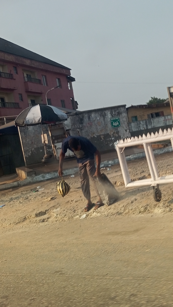 A man in a blue shirt and tan pants stands on a dirt road, bent over. He holds a small, striped object in his left hand and a clear plastic bag in his right. Behind him is a white metal barricade on wheels. In the background, there's a building with a black and white umbrella in front of it, and another building behind the barricade. The scene is lit by daylight, casting long shadows. The road in the foreground is asphalt.