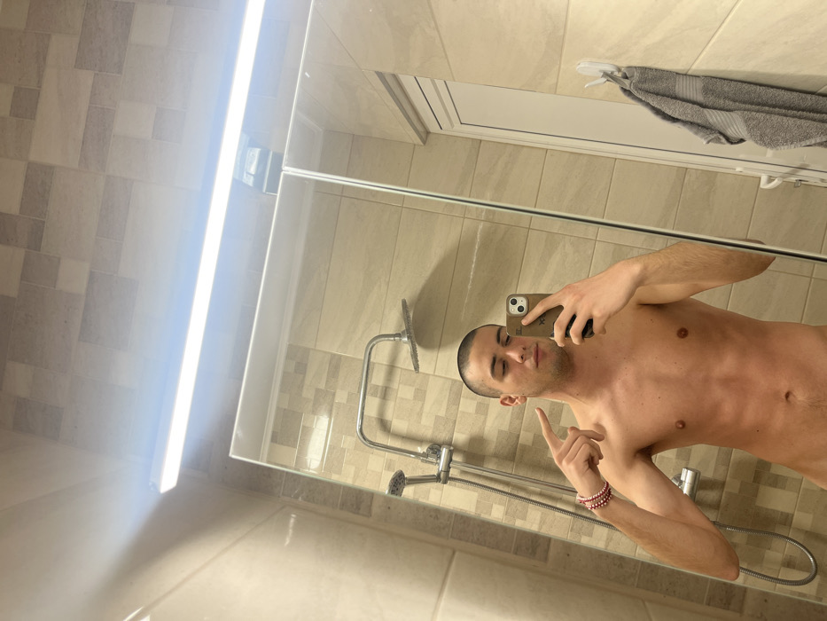 - "A shirtless male subject with short, buzzed hair, appearing to be in his early 20s, is captured in a mirror selfie within what is identified as a bathroom located in Burgas, Bulgaria" by FM-EiC792, licensed under CC BY 4.0