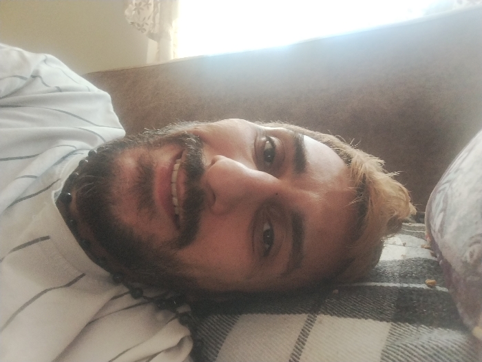 An adult male is depicted lying on his back in an indoor residential setting. The specific location within Parand, Iran, is not identifiable from the visual evidence. The subject has light skin, a dark beard and mustache, and short, light brown/blonde hair. He wears a light-colored, vertically striped shirt and a dark beaded necklace. He is smiling, showing his upper teeth, and looking directly towards the camera. His head rests on a black and white checkered or plaid patterned blanket, which covers a light brown upholstered sofa or couch. Small, light-colored particulate matter is visible on the blanket near his head. Bright natural light illuminates the scene from the background, creating highlights on the sofa. A blurred, dark-colored object is partially visible on the far right edge of the frame.