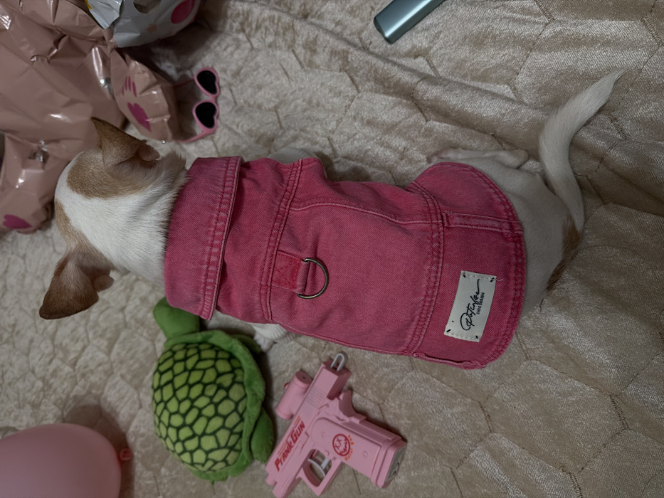 A small, short-haired dog, predominantly white with light brown markings on its head, is viewed dorsally, facing away from the camera. The dog wears a bright pink denim jacket featuring a collar, a metal D-ring on the back, and a white label with "Petifou CHIC DESIGN" on its lower rear. It is positioned on a light beige, quilted or textured surface. To the dog's left, a green plush toy turtle with a distinct shell pattern and a pink plastic toy pistol, labeled "Prank Gun" with a smiley face graphic, are present. To the dog's right, a pair of pink, heart-shaped sunglasses, several pink foil balloons (one resembling a pig), and a slender, metallic blue-silver object are visible. The scene is located in Yambol, Bulgaria.