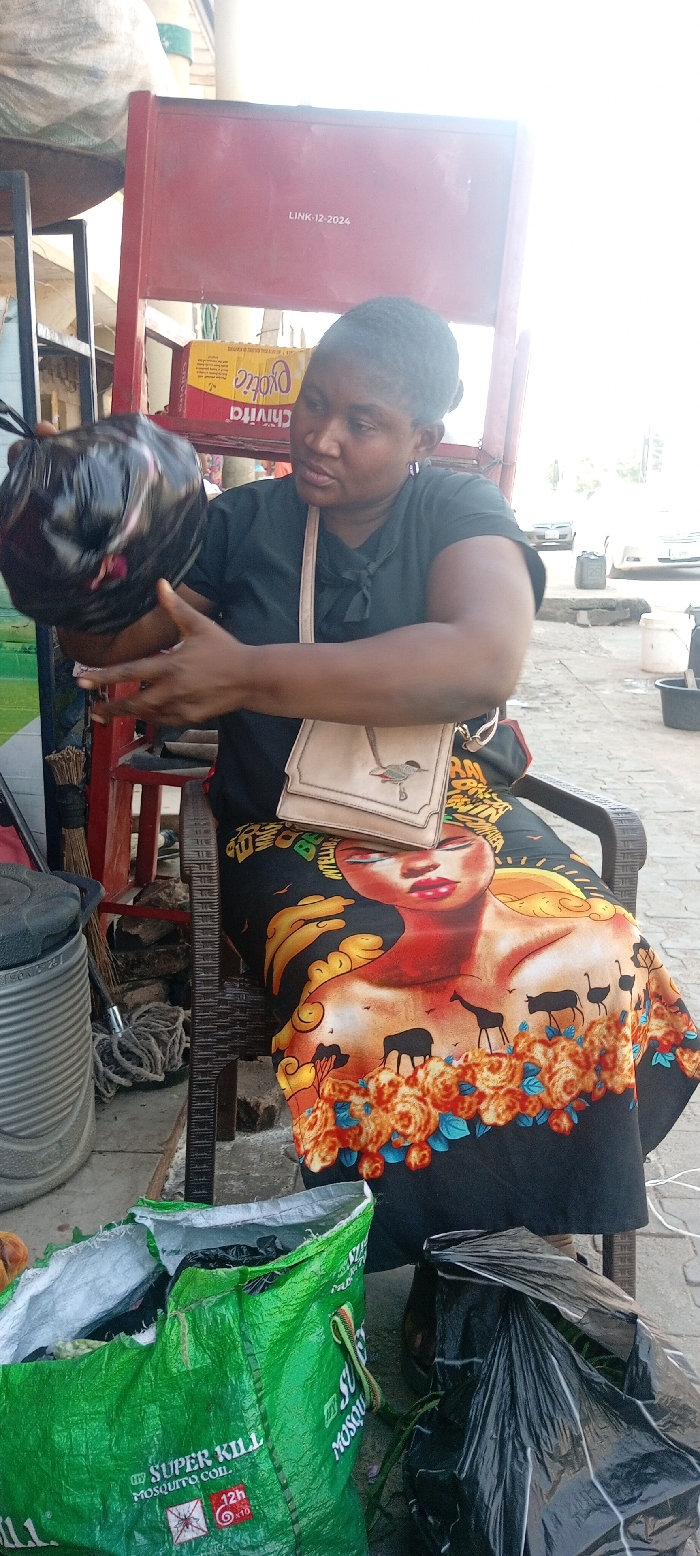 In Kwachiri, Nigeria, an adult female is seated outdoors, facing slightly left. She wears a black short-sleeved top and a long black skirt featuring a graphic of a woman's face, animals (giraffes, cows, birds), and floral patterns. A light beige crossbody bag with an embroidered bird design hangs over her left shoulder. She holds a black plastic bag with both hands, appearing to examine its contents. On the paved ground in the foreground, a large green open woven sack marked "SUPER KILL MOSQUITO COIL" contains items, positioned next to a second open black plastic bag also holding items. To the far left, a grey cylindrical container and several brooms are visible. In the background, a red metal structure bearing the text "LINK-12-2024" is present, alongside partially visible product packaging labeled "Chivita" and "Exotic." A street with vehicles, a black jerrycan, and a white bucket are discernible in the distance under bright sunlight.
