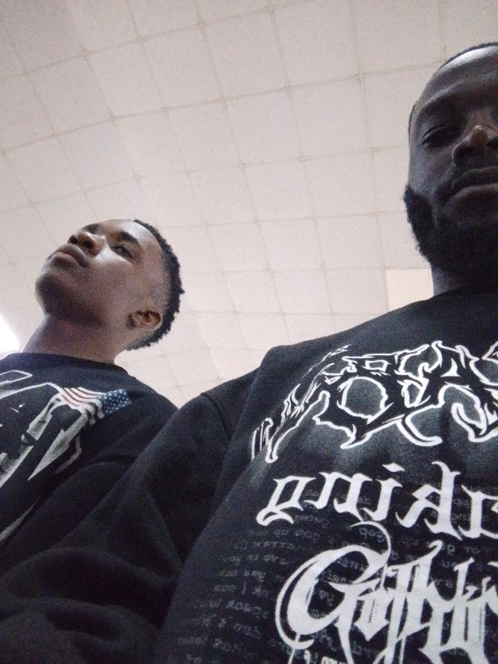 The image captures two males of African descent in an indoor setting with a white acoustic tile ceiling. The individual on the left, appearing younger, has short dark hair and is depicted in profile, looking upwards and to the left. He wears a black long-sleeved shirt with a graphic featuring an American flag design. The individual on the right, an older male with a dark beard, is partially visible, facing the camera. He wears a black long-sleeved shirt adorned with a complex white gothic-style graphic design. The scene is illuminated by overhead lighting. The location is an interior space, likely a public or commercial building, in the city of Unknown, Unknown.